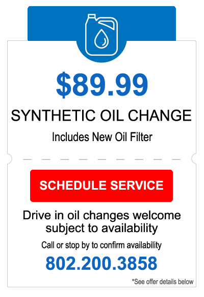 Specialty vehicles, HD vehicles, Diesels and canister oil filters extra. Includes up to 5 quarts of motor oil. VT Sales tax and waste disposal & shop supplies extra. See advisor for complete details.